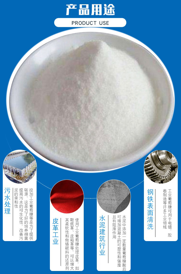 4、工業(yè)葡萄糖可以作水泥摻合劑:水泥中添加一定數(shù)量葡萄糖酸后,可增加混凝土的可塑性和強(qiáng)度,且有阻滯作用也就是將混凝土的可塑時(shí)間從幾小時(shí)延長至幾天,而不影響其牢度。